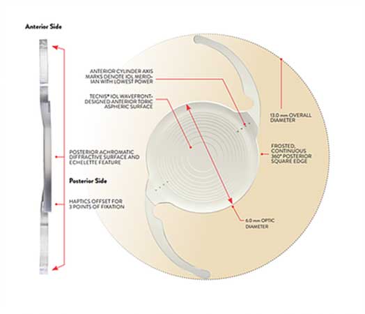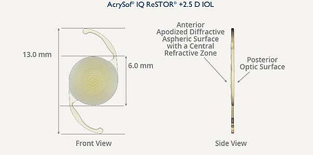 An Apodized Diffractive lens with multiple zones, which responds to the way light is focused in the eye at various distances – the center is optimized for near vision, with a gradual tapering to the outer edge of the lens that is optimized for distance. The ReSTOR lens provides excellent far away and close-up vision. It provides reasonable intermediate vision (computer distance). It functions almost like glasses with bifocals. AcrySof ReSTOR was approved by the FDA in 2005. Dr. Tinoosh uses the latest generation, the ReSTOR aspheric IOL. This is a wavefront optimized intraocular lens that improves on the previous generation. The ReSTOR IQ currently comes in 2 versions, for maximum optimization of near vision.